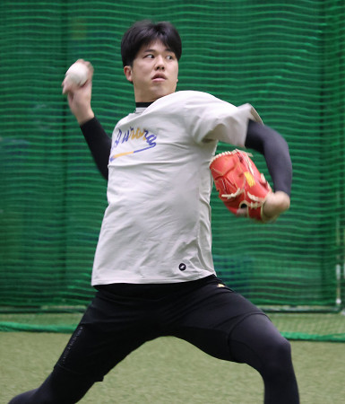 自主トレーニングを公開し、キャッチボールする阪神の才木。昨季を上回る活躍を誓い、「しっかりチームの中心として、シーズンを通して投げ切れたらいい」と抱負を述べた=13日、兵庫県尼崎市 【時事通信社】