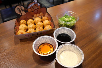 たこ焼き店「会津屋 ユニバーサル・シティウォーク大阪店」(大阪市此花区島屋6)が1月15日、3種類のソースを別添えで提供する「たこ焼き4変化盛」の提供を始めた。