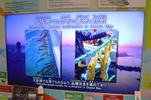 「舞昆のこうはら」は3つのプロジェクトを紹介。展示の目玉は、同社が約6年かけて開発した食べられる透明フィルム「アルフィル」。昆布由来の水溶性食物繊維「アルギン酸」をフィルム状に加工したもので、水に溶けやすいことからカップ麺のかやく袋やケーキの周囲に巻かれる透明フィルムなどでの活用が期待されているという。このほか、「アルフィル」に美容成分「シルクフィブロイン」を加えたフェースパック「つるつるシルク」や、大阪湾での昆布の大規模養殖を目指す「里帰り昆布プロジェクト」に関する映像資料やパネルも展示する。