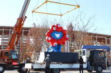 セレモニー後、モニュメントをクレーンでつり上げ、トラックの荷台に積み込んだ。来年3月ごろ、大阪・吹田の万博記念公園内に設置予定。