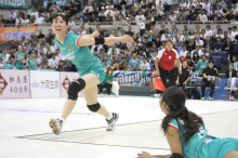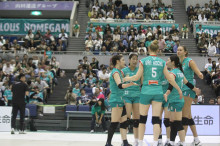 試合後に会場のファンにサインボールを投げる大阪マーヴェラスの選手たち