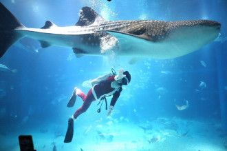 海遊館(大阪市港区海岸通1)の水槽に12月1日から、サンタクロースに扮(ふん)した「サンタダイバー」が登場している。