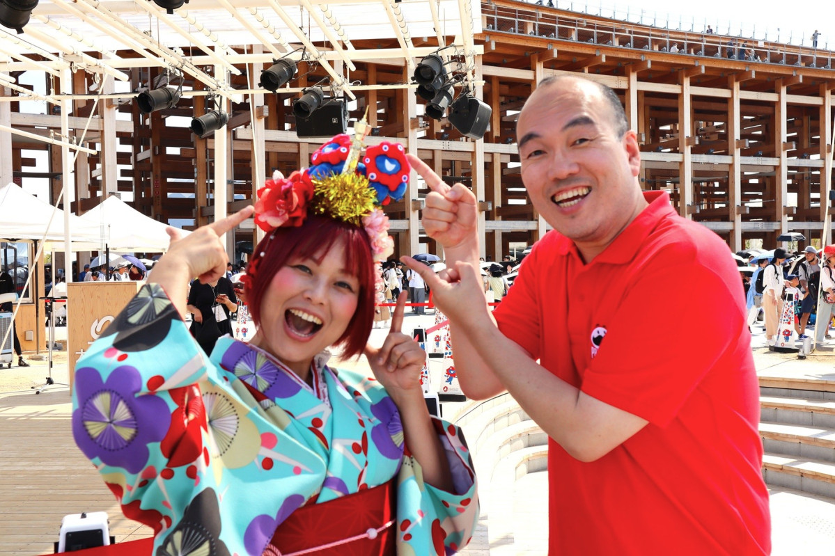 シンガー・ソングライターむんむさんが9月28日、大阪・関西万博のポップアップステージ東内でトーク&ライブ「むんむのやってるデー!万博デー!」を行った。応援に駆け付けた通天閣観光の高井隆光社長(右)