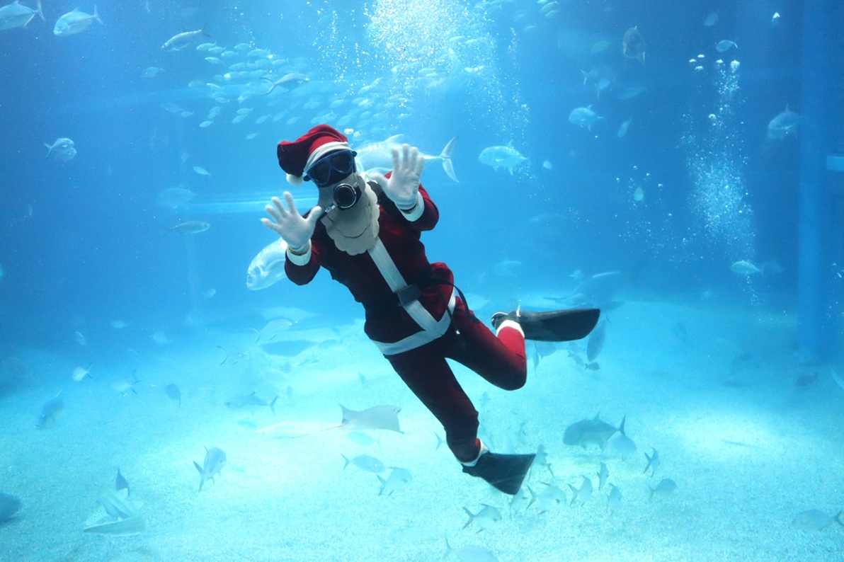 海遊館(大阪市港区海岸通1)の水槽に12月1日から、サンタクロースに扮(ふん)した「サンタダイバー」が登場している。