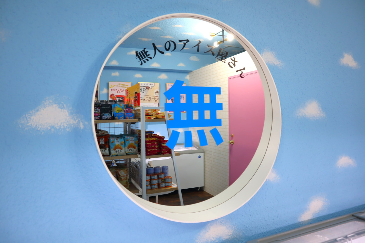 無人販売店「無人のアイス屋さん 朝潮橋店」が12月8日、朝潮橋駅近くにオープンした。フォトスポット用に店名が入った鏡