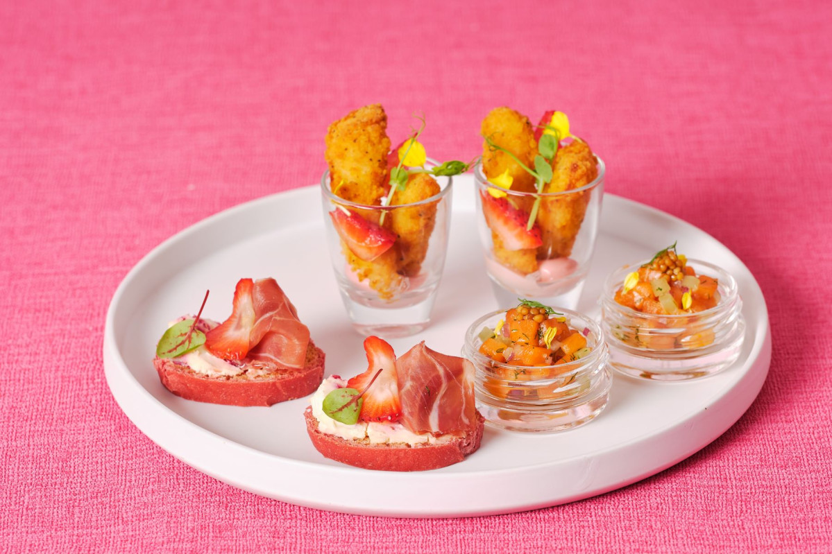 「いちごとスウィートベアのアフタヌーンティー」企画が1月9日、大阪・南港の結婚式場「アートグレイス ウェディングコースト大阪」で始まる。チキンやバゲットなどをのせたセイボリープレート
