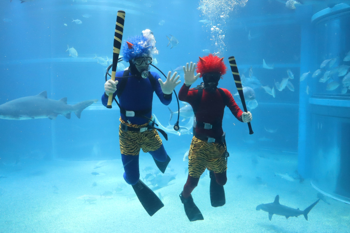 鬼に扮した「オニさんダイバー」が1月26日から、海遊館5階の「太平洋」水槽に登場している。赤鬼、青鬼の格好で登場
