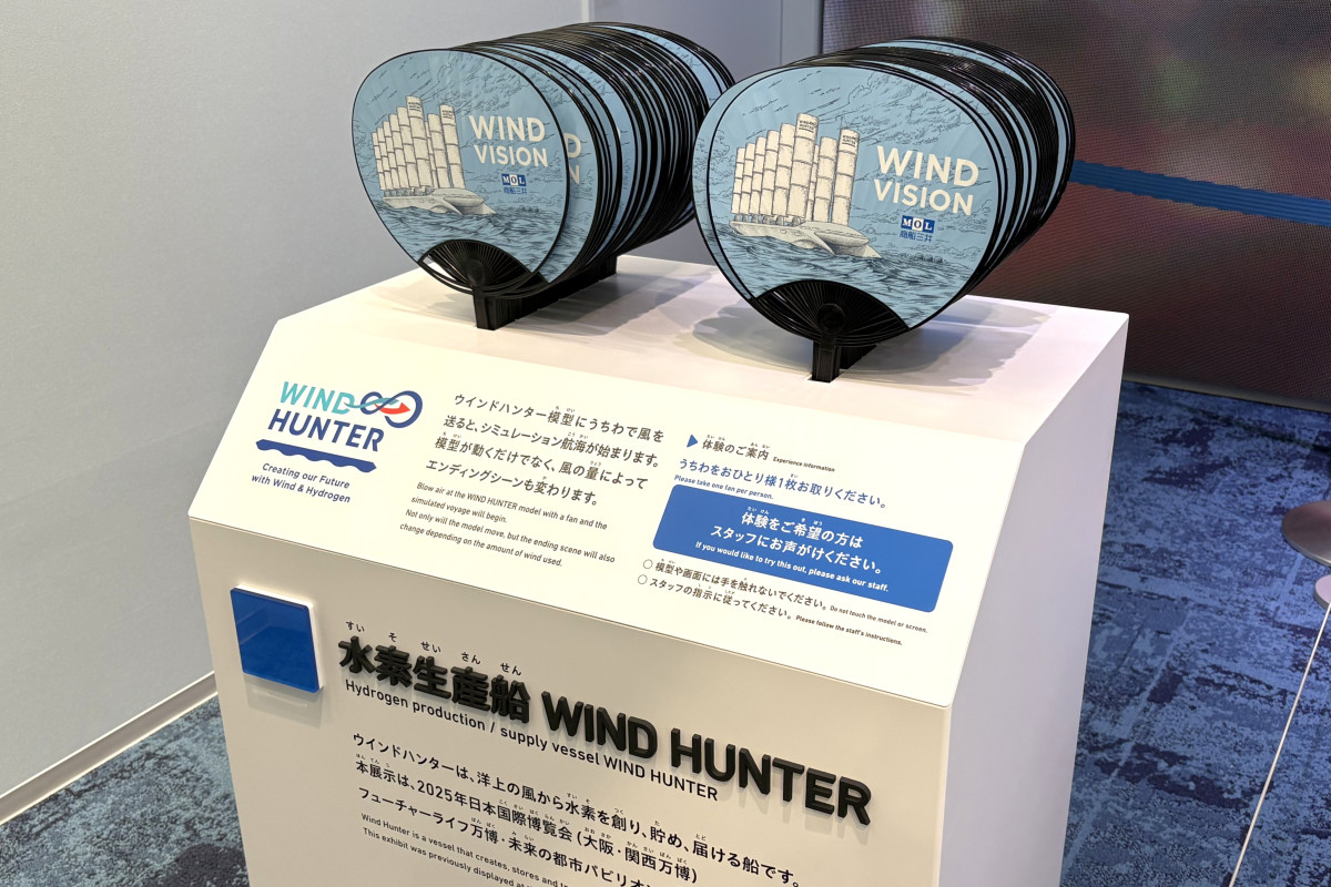 水素を作る船「ウインドハンター」の模型が2月6日から、船の体験型ミュージアム「ふねしる」で展示されている。「ウインドハンター」のアトラクションで使ううちわ