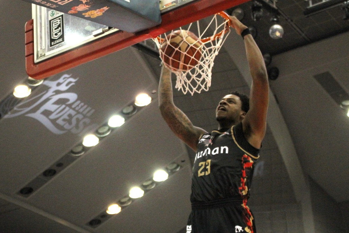 Bリーグ・大阪エヴェッサが2月14日・15日、おおきにアリーナ舞洲で京都ハンナリーズと対戦し2連敗を喫した。ダンクシュートを決めるシリル・ニースミス選手(撮影:大塚淳史)