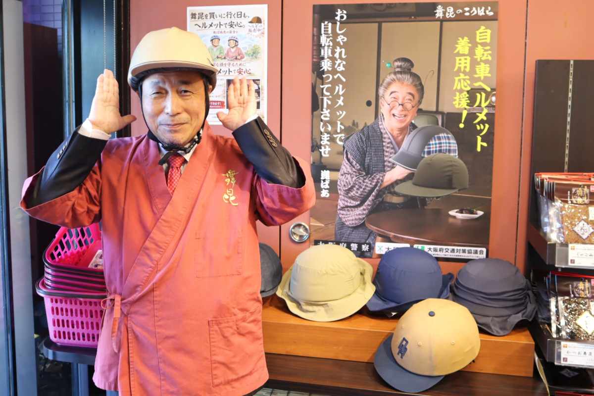 昆布専門店「舞昆のこうはら」(大阪市住之江区東加賀屋1)が3月5日、自転車ヘルメット着用を推進するキャンペーンを始めた。