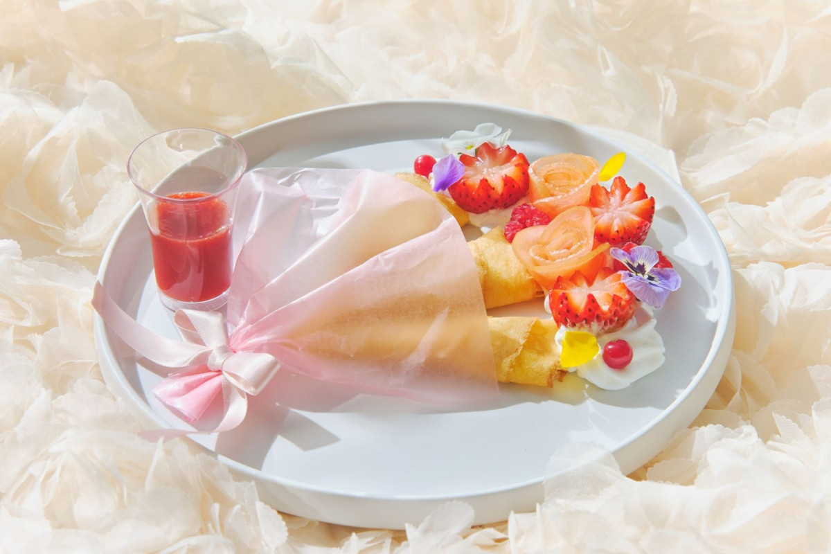 「フラワーマルシェアフタヌーンティー」が3月21日から、大阪・南港の結婚式場「アートグレイス ウェディングコースト大阪」で提供されている。オプションで用意する「赤い果実のクレープブーケ」