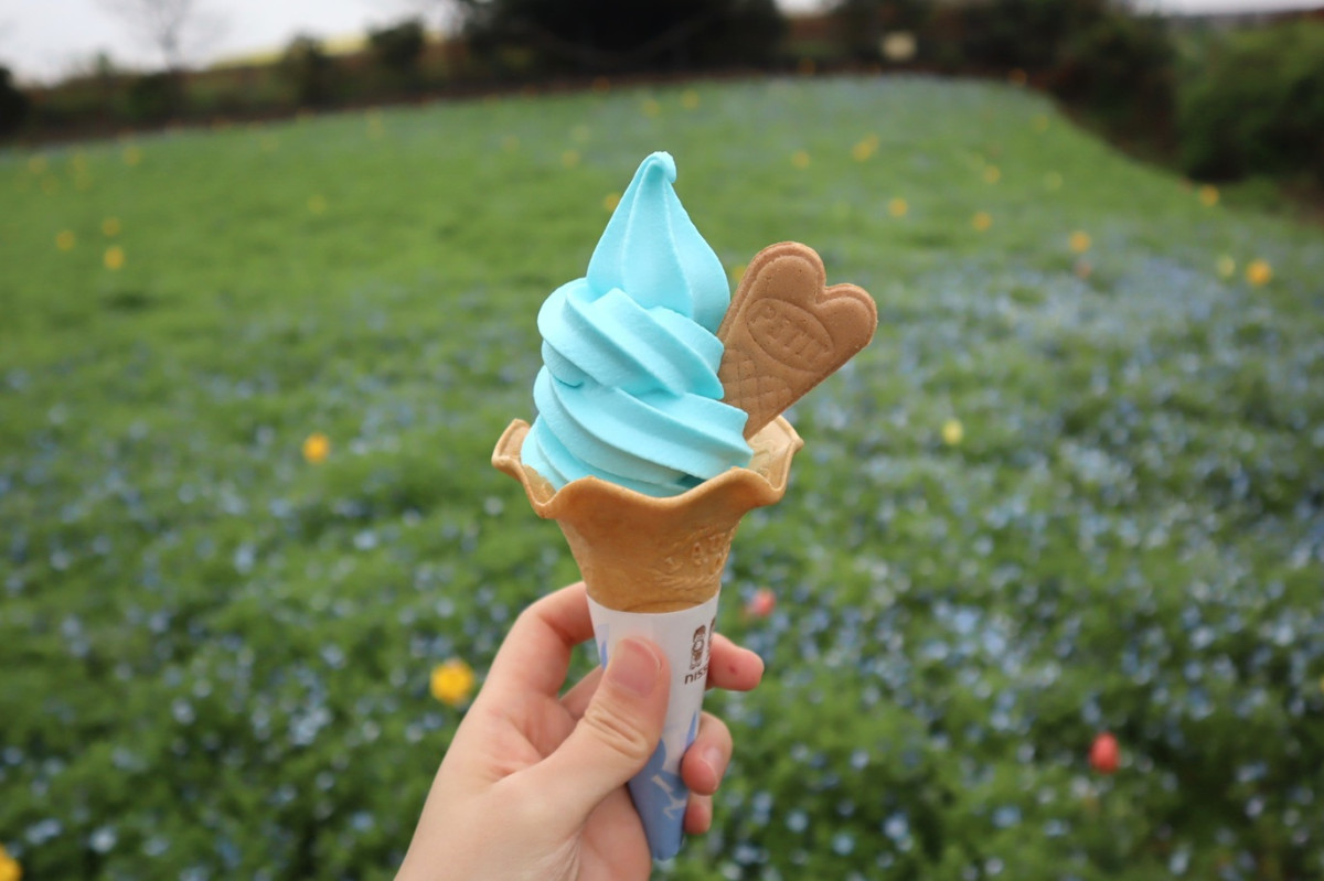 大阪まいしまシーサイドパークで「ネモフィラ祭り2026」が4月11日、始まった。青いソフトクリーム「ブルーアイ」