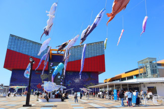 海遊館(大阪市港区海岸通1)前イベント広場で4月11日、同館で展示している生物をかたどった「オリジナルのぼり」の装飾が始まった。