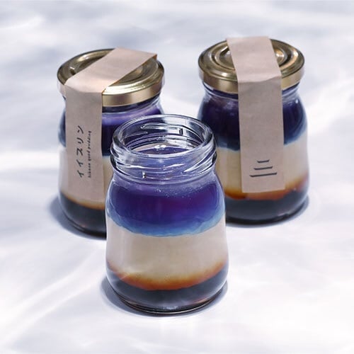 彦根イイプリン(ビワコブルー)日本一の湖・琵琶湖をイメージしたビワコブルー。ジュレ部分は青いバタフライピーと透明なレモンのジュレが層を成し、美しい水を思わせるグラデーションを作り出します。レモン風味の爽やかな味わいと滑らかなプリンが絶妙にマッチします。