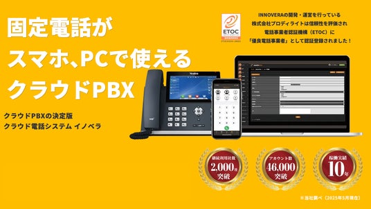 プロディライトは、「電話のDX」を推進するクラウドPBX「INNOVERA」(https://innovera.jp/)を提供しています。INNOVERAは、スマートフォンやPCにて会社の電話番号の発着信を可能にした現代の働き方に適した電話環境を提供する“Japan Quality”の国産クラウドPBXで、ビジネスフォン用途はもちろん、少人数のコールセンターの立ち上げ等、様々な用途に対応することもできます。