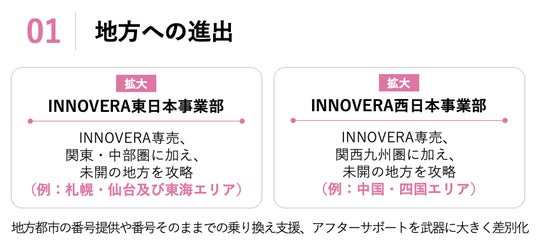プロディライトは2025年8月期(18期)中間期の決算説明の際に、成長戦略として主力サービス「INNOVERA」の地方への進出を掲げております。上記の資料は前期のものとなりますが、こちらは今後も継続して行っていくプロディライトの重要な戦略となっております。