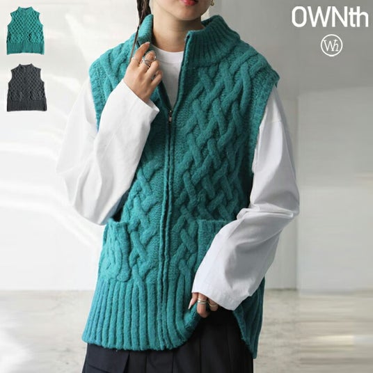 立体的な籠編み風デザインが印象的な、レイヤードコーデに映えるユニセックス仕様のニットベストです。