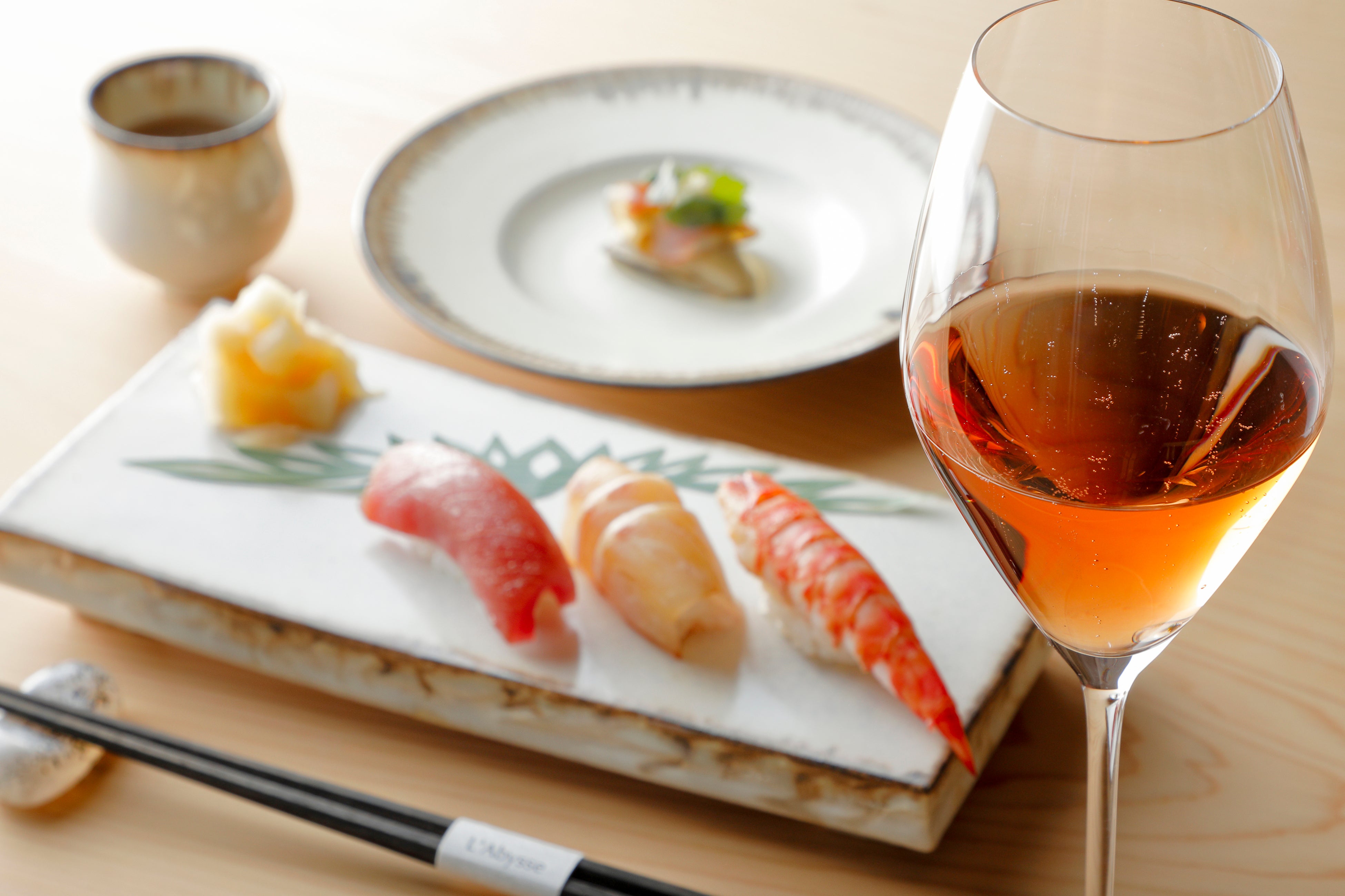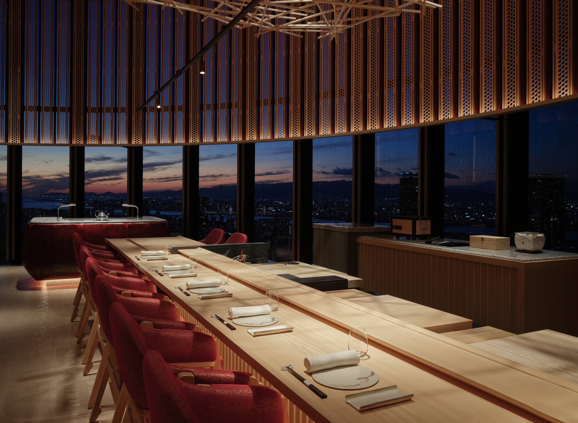 フランスのミシュラン3つ星シェフ、ヤニック・アレノ氏と、和食の職人として30年の経験を持つ料理長 安田至が生み出す、モダンで革新的な料理が集結するレストラン。パリ、モナコに続く世界で3店舗目、「鮨ラビス」日本初上陸として開店し、フュージョンではなく、純粋な和と洋が呼応し合う品々を提供しています。ホテル最上階の37階に位置し、大阪の街を見渡せる素晴しいロケーションに、珊瑚をモチーフにした壁画やゴージャスなファブリックなど、パリやモンテカルロの店舗と同じアートピースを携えたコンテンポラリーで静謐な空間も、その魅力の一つ。美しい夕日の景色を眺めながら、気兼ねなく食事のひとときをお楽しみいただける個室も備えています。
